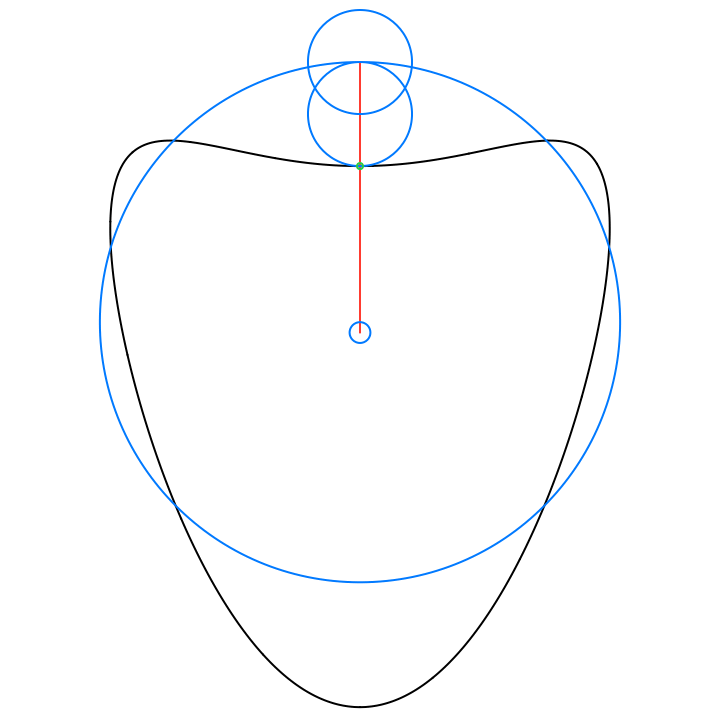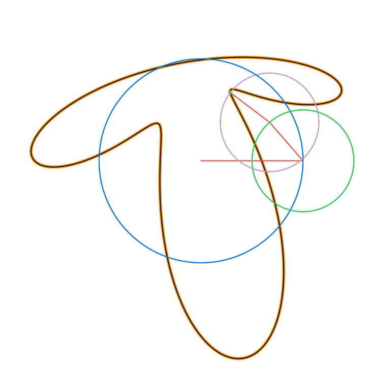 This way a 2D curve, represented by a complex valued function f(t) = (x(t), y(t)) = x(t) + i y(t), can be visualized as a chain of epicycles, or circles upon circles, with each of the circles corresponding to a component Anei n t of the complex Fourier series, beginning at the origin given by A0:
