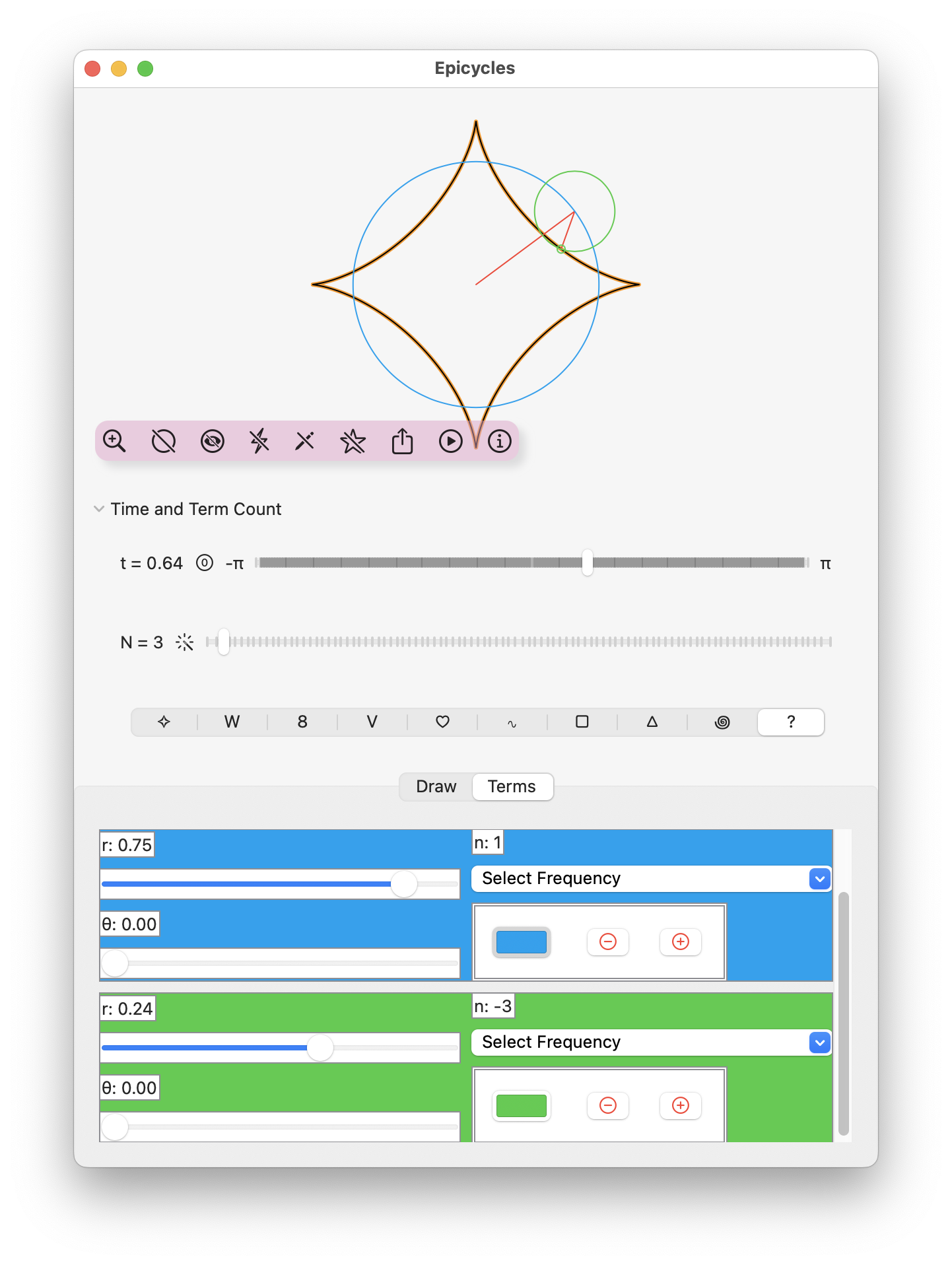 In the Epicycles app tap the ? function type, select the Terms tab, and enter the corresponding terms of the astroid's Fourier series.
