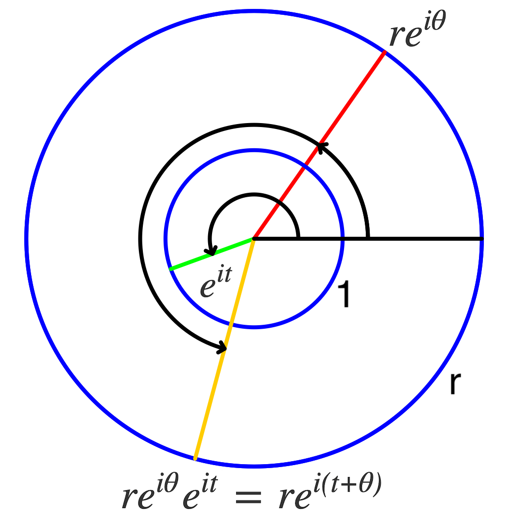 Since the complex exponential satisfies the following exponential law, complex multiplication is a rotation with scaling. When multiplying complex numbers in this form the exponents add (rotation) and the magnitudes multiply (scaling):