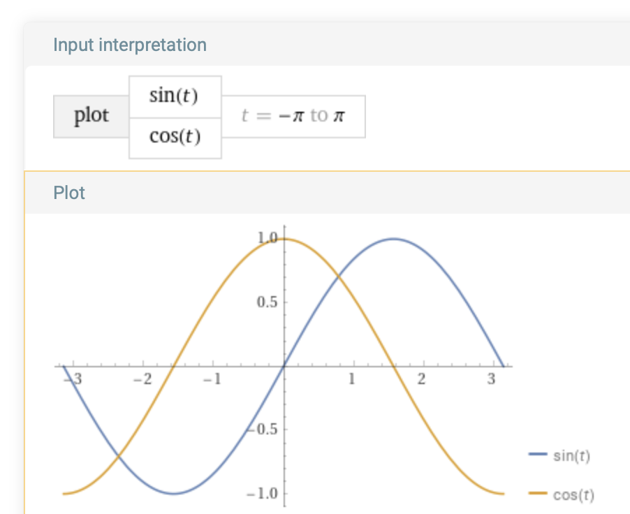On the interval [-π,π] functions sin(t) and cos(t) look like this:
