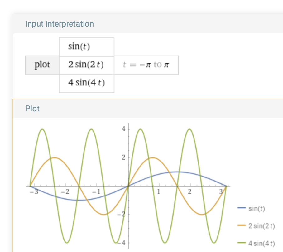 Here is a plot of some sin(nt) functions whose angular frequencies n=1,2,4 are multiples of one another: