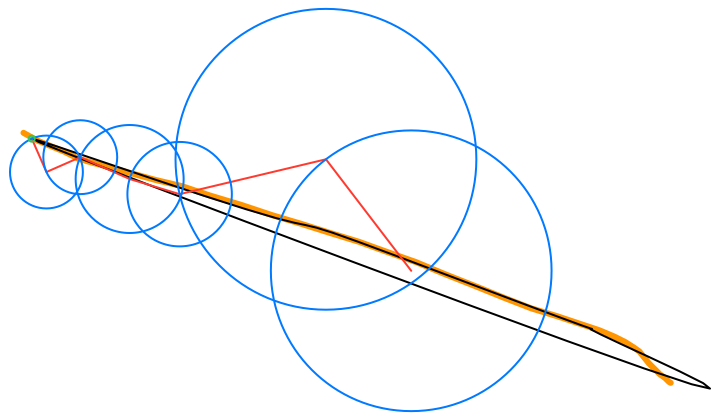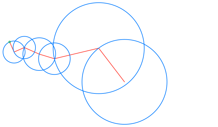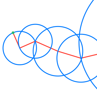If N is the desired number of terms chosen for the Fourier series, the red segmented line at time t in the above diagram is generated as follows by computing partial sums for n = 0,1,-1,2,-2,...,N,-N, implemented by the function fourierSeriesEpicyclePoints, described in Calculate Fourier Series: