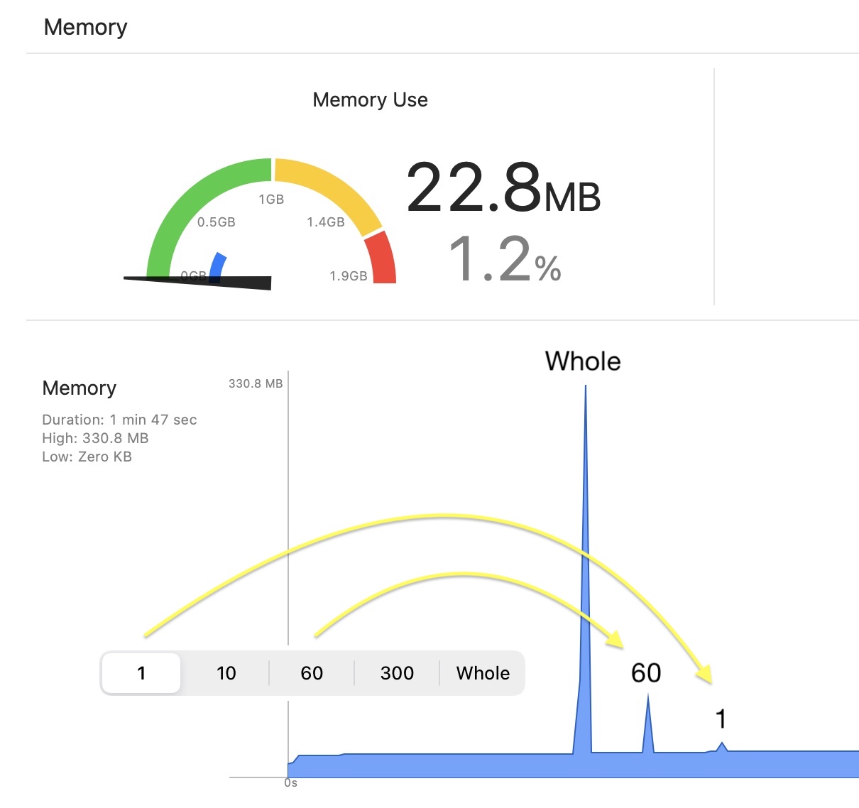 Inspect the memory view of Xcode while the app processes audio to see how it is affected by the choices: