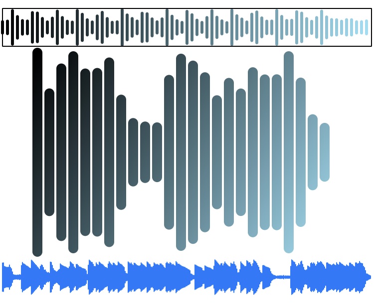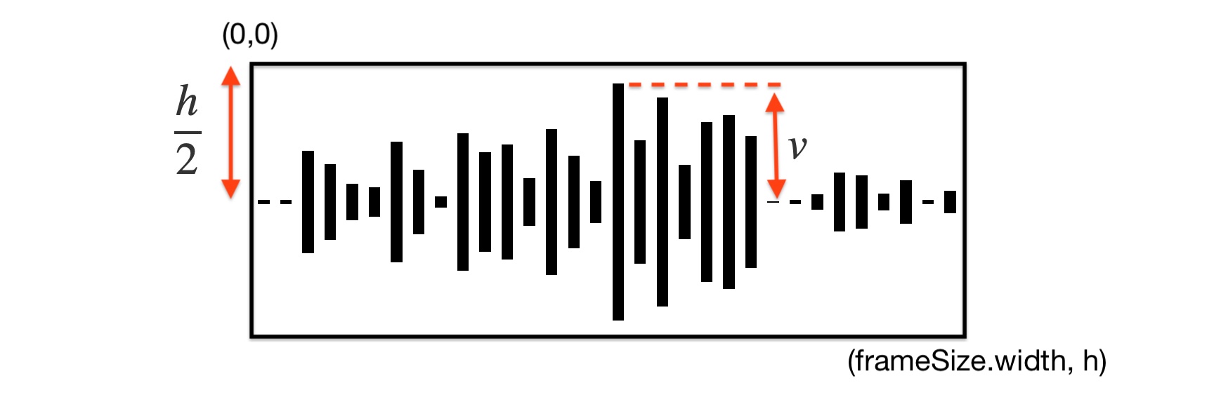 At the standard sampling rate of 44,100 samples per second, and 16-bit quantization, the sample count and amplitude range of even short duration audio far exceeds the pixel dimensions of the display view. A good graphical representation of the sound from its samples requires signal processing in the range and domain dimensions to fit in the view. This dual dimension task can be accomplished with the help of two signal processing functions in the Accelerate framework :